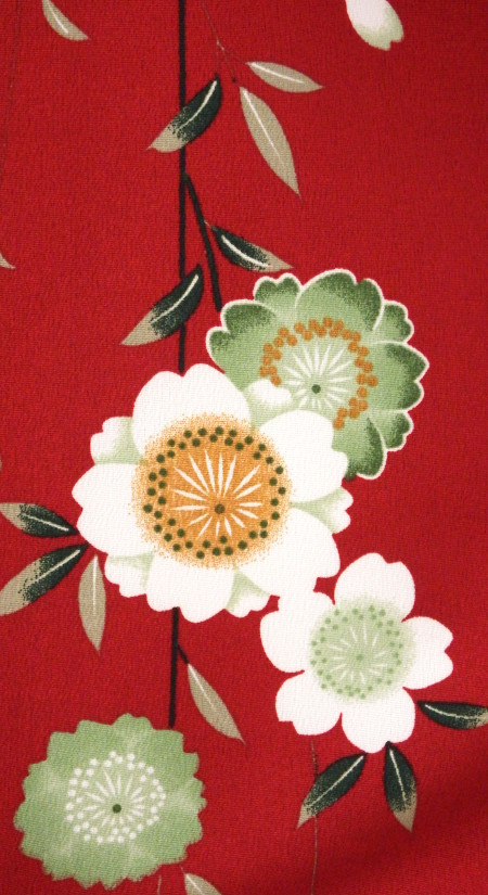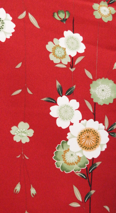枝垂れ八重桜を全面に描いた和風な可愛さの着物です。はっきりとした色合わせのセットです。