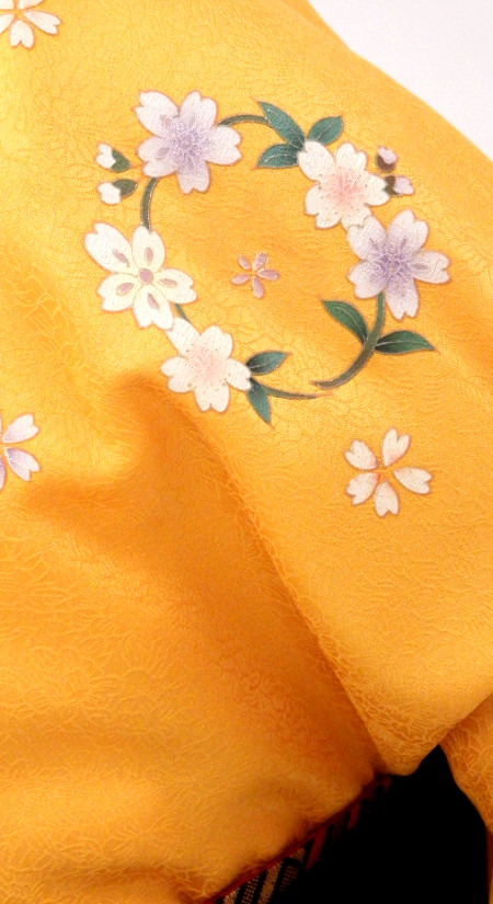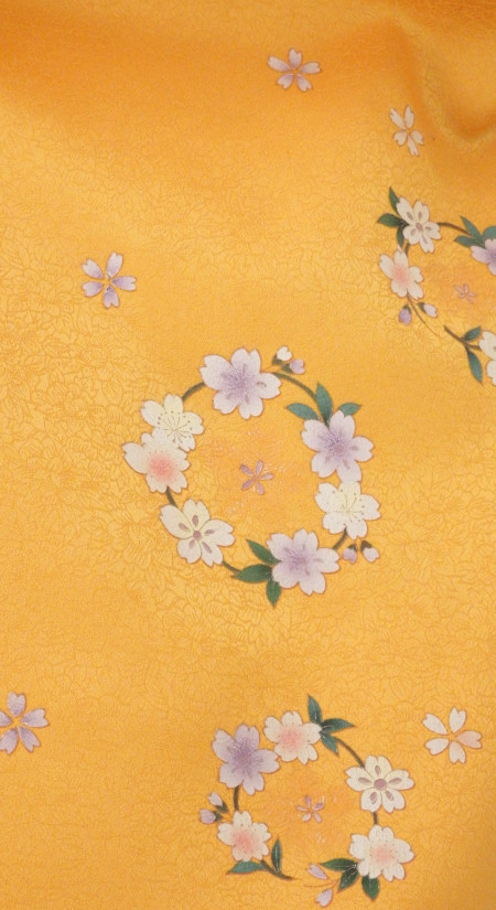 花輪をぽんぽんと配した愛らしいデザイン。地模様のある生地が高級感を感じさせる着物です。