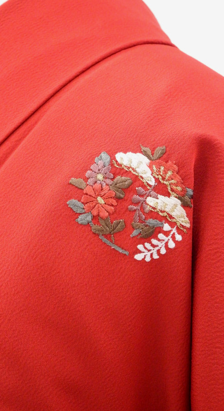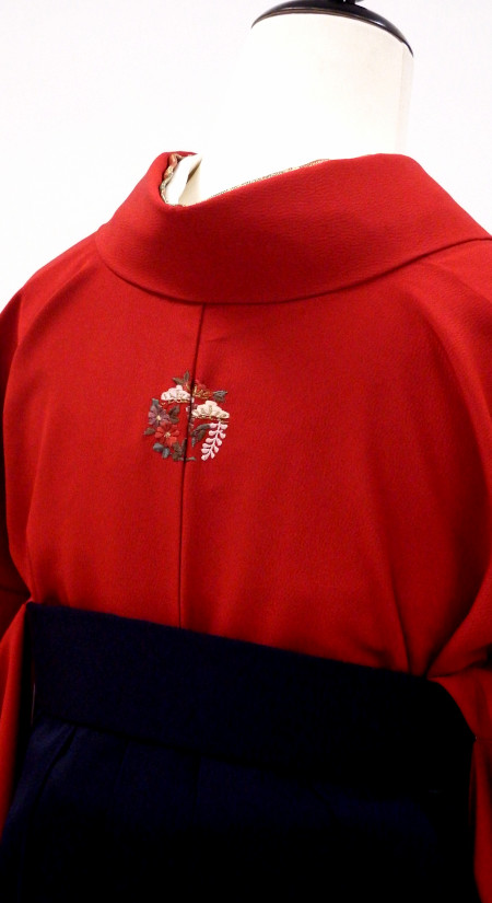 刺しゅう紋を胸と背中に入れた無地の着物に刺しゅうの袴を合わせた正統派でシンプル可愛い組み合わせです。