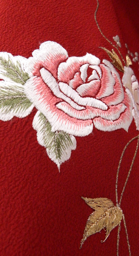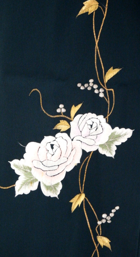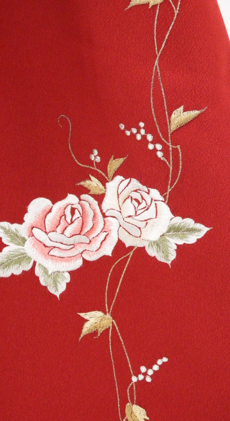 つるバラの刺しゅうがお揃いになる着物と袴のセットです。シンプルさが魅力です。