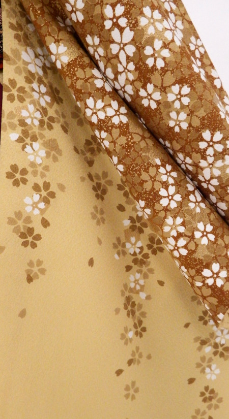 桜吹雪が肩に散りかかる優美なデザインの着物です。ボカシの袴でモダンなコーディネートに。