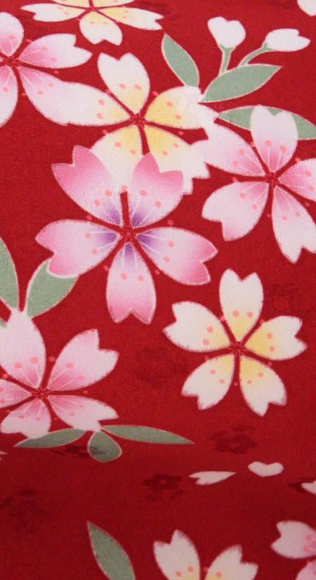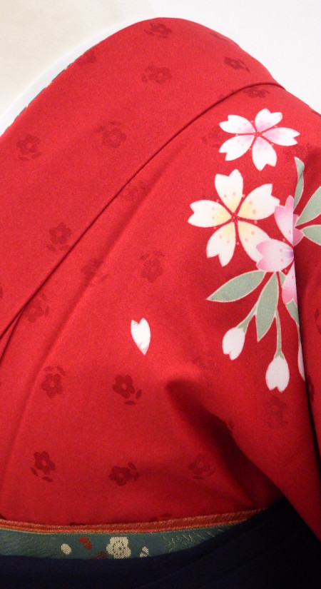 花柄の地模様が織り込まれた生地に桜柄が可憐です。正統派の紺色の袴を合わせた上品スタイル。