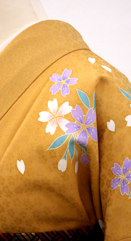 花柄の地模様のある生地に桜を描いた着物に紺色の袴を合わせた上品なコーディネートです。