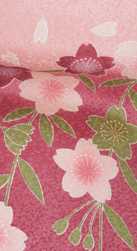 手をあげると袖にしだれ桜が見える上品なデザインの着物です。背中にも背紋ふうに桜が描かれています。