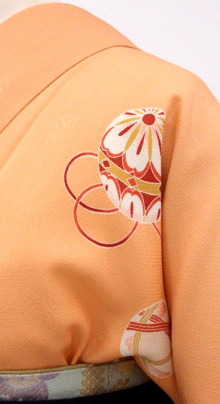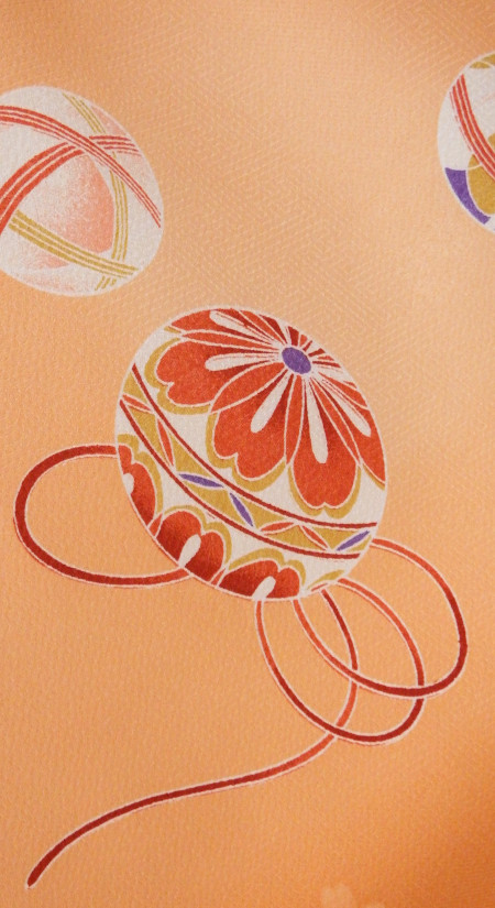 着物も袴も手まりと組紐の柄でお揃いコーディネート。オレンジ×紺色が上品な明るさです。