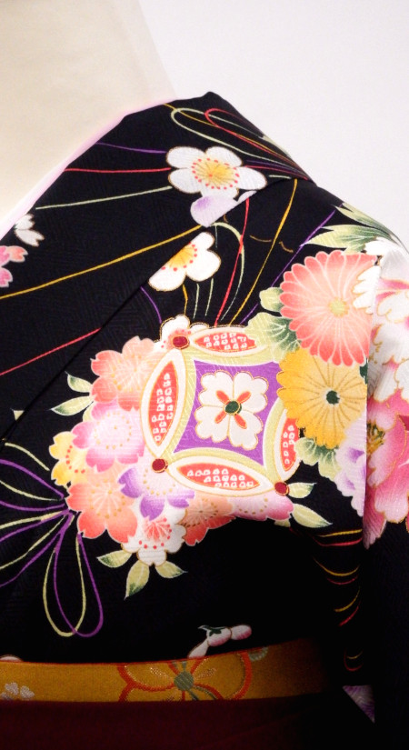 黒地に鮮やかな配色のくす玉を散らした和かわいい着物にエンジ色の袴がフェミニンな雰囲気に。