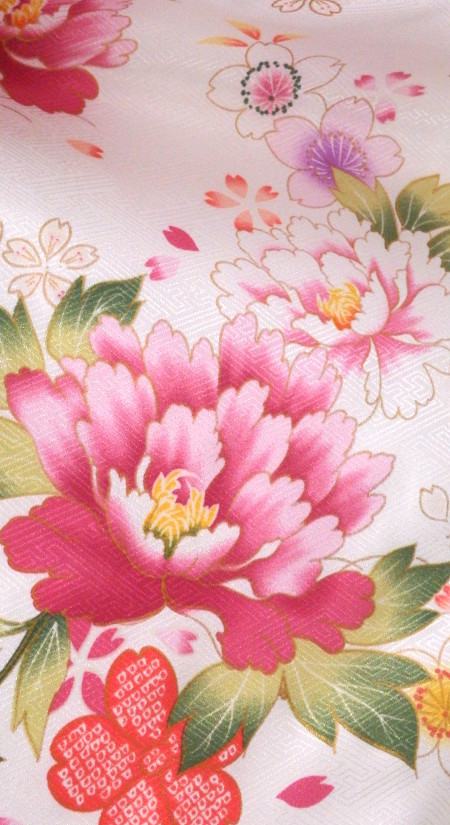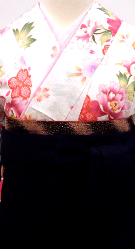 鮮やかな色調の牡丹や桜を描いた白の着物に紺色の袴を合わせてメリハリのあるコーディネートに。